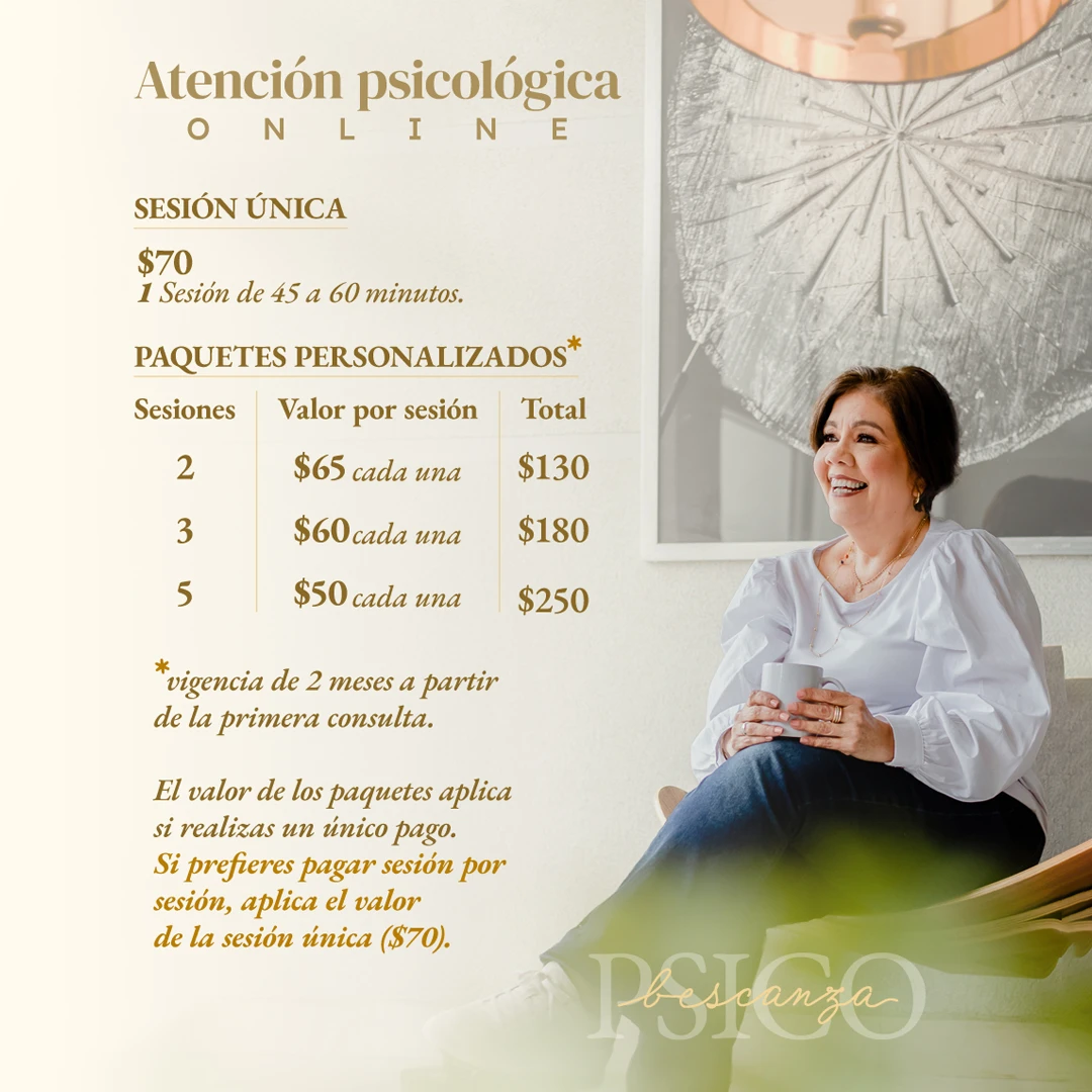 Sesión de 45 a 60 minutos de atención, con foco en TCC (terapia cognitivo conductual) para tratar diversos temas que puedan afectar tu salud mental.